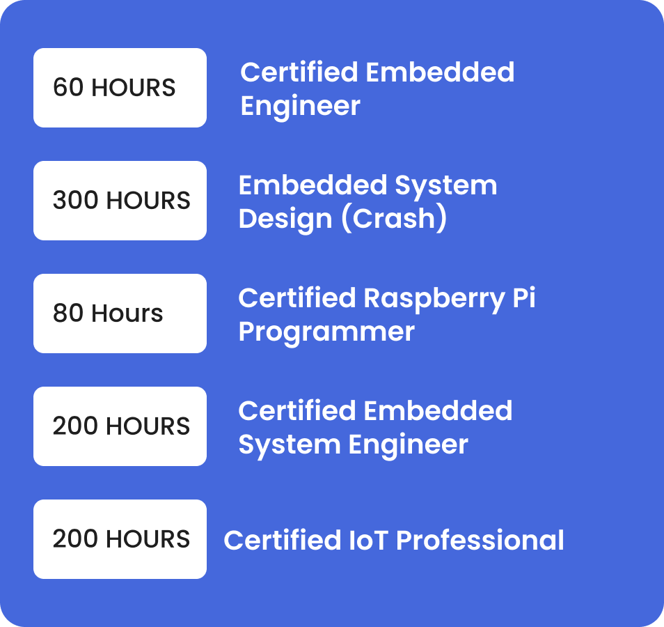 Basic Electronic Components / Analog & Digital Electronics, Fundamentals of C Programming / Embedded C, Introduction to Microcontrollers and Embedded System,  AVR /  PIC  /  ARM 7 / 8051 Microcontroller, Python Programming – Raspberry pi 3 Microprocessor, Communication Protocols (UART,USART,I2C,SPI,CAN)